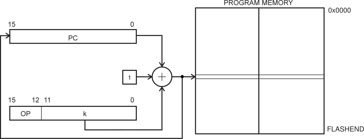 Program execution continues at address PC + k + 1. The relative address k is from -2048 to 2047.