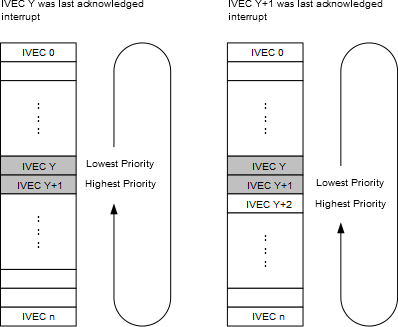 Static scheduling may cause starvation, i.e. some interrupts might never be serviced. To avoid this, the CPUINT offers round robin scheduling for normal priority (LVL0) interrupts. In round robin scheduling, CPUINT.LVL0PRI contains the number of the vector number in IVEC with the lowest priority. This register is automatically updated by hardware with the interrupt vector number for the last acknowledged LVL0 interrupt. This interrupt vector will, therefore, have the lowest priority next time one or more LVL0 interrupts are pending. Figure 1 explains the new priority ordering after IVEC Y was the last interrupt to be acknowledged, and after IVEC Y+1 was the last interrupt to be acknowledged.