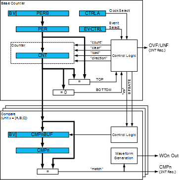 The counter value is also compared to the TCAn.CMPx registers. These comparisons can be used to generate interrupt requests. The Waveform Generator modes use these comparisons to set the waveform period or pulse width.
