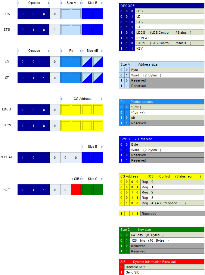 Communication through the UPDI is based on a small instruction set. The instructions are used to access the internal UPDI and ASI Control and Status (CS) space, as well as the memory mapped system space. All instructions are byte instructions and must be preceded by a SYNCH character to determine the baud rate for the communication. See UPDI UART for information about setting the baud rate for the transmission. The following figure gives an overview of the UPDI instruction set.