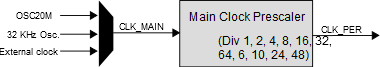 CLK_MAIN is fed into a prescaler before it is used by the peripherals (CLK_PER) in the device. The prescaler divide CLK_MAIN by a factor from 1 to 64.