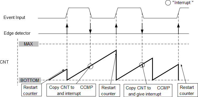 The input capture pulse-width measurement will restart the counter on a positive edge and capture on the next falling edge before an interrupt request is generated. The interrupt flag is automatically cleared when the high byte of the capture register is read. The timer will automatically switch between rising and falling edge detection, but a minimum edge separation of two clock cycles is required for correct behavior.