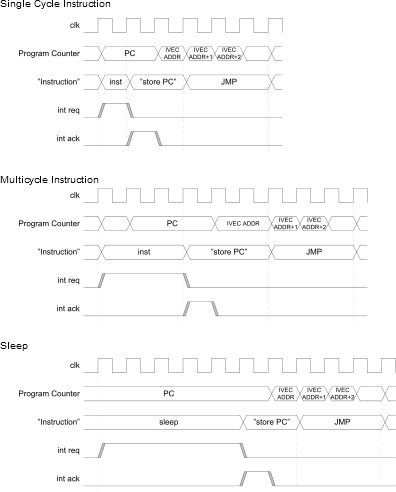 If an interrupt occurs when the device is in sleep mode, the interrupt execution response time is increased by five clock cycles. In addition, the response time is increased by the start-up time from the selected sleep mode. See Figure 1, third diagram.