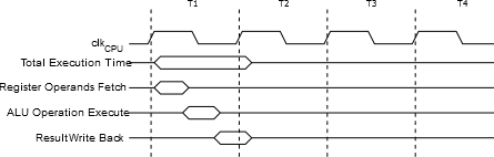The following figure shows the internal timing concept for the register file. In a single clock cycle, an ALU operation using two register operands is executed and the result is stored in the destination register.