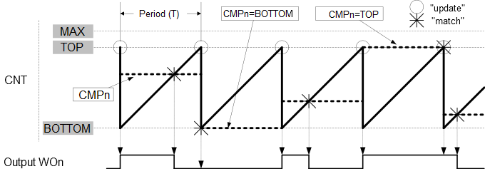 For single-slope Pulse-Width Modulation (PWM) generation, the period (T) is controlled by TCAn.PER, while the values of TCAn.CMPn control the duty-cycle of the WG output. The figure below shows how the counter counts from BOTTOM to TOP and then restarts from BOTTOM. The waveform generator (WO) output is set at TOP and cleared on the compare match between the TCAn.CNT and TCAn.CMPn registers.