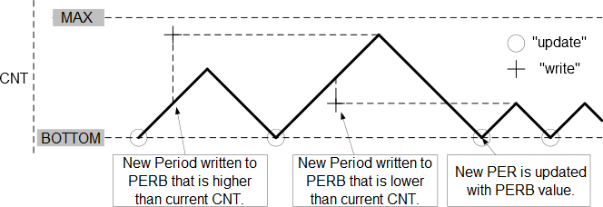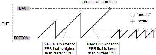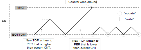 and TCAn.PER registers are continuously compared: if a new TOP value is written to TCAn.PER