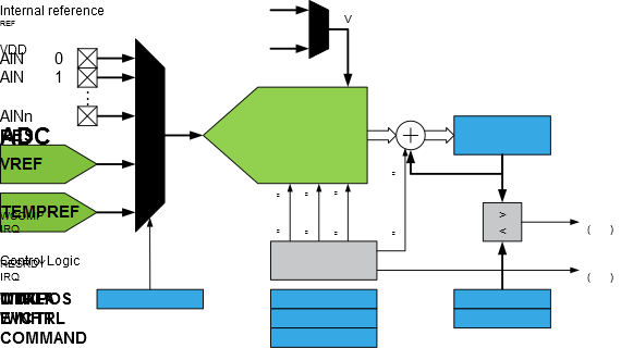 The analog input channel is selected by writing to the MUXPOS bits in the MUXPOS register (ADC.MUXPOS). Any of the ADC input pins, GND, can be selected as single-ended input to the ADC. The ADC is enabled by writing a ‘1’ to the ADC ENABLE bit in the Control A register (ADC.CTRLA). Voltage reference and input channel selections will not go into effect before the ADC is enabled. The ADC does not consume power when the ENABLE bit in ADC.CTRLA is ‘0’.
