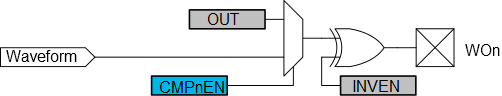 The figure below shows the port override for TCA. The timer/counter compare channel will override the port pin output value (OUT) on the corresponding port pin. Enabling inverted I/O on the port pin (INVEN=1 in PORT.PINn) inverts the corresponding WG output.