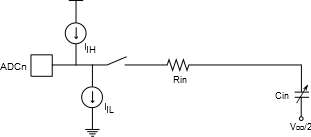 The analog input circuitry is illustrated in Figure 1. An analog source applied to ADCn is subjected to the pin capacitance and input leakage of that pin (represented by IH and IL), regardless of whether that channel is selected as input for the ADC. When the channel is selected, the source must drive the S/H capacitor through the series resistance (combined resistance in the input path).