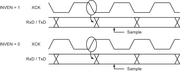 The I/O pin can be inverted by writing a '1' to the Inverted I/O Enable bit (INVEN) in the Pin n Control register of the port peripheral (PORTx.PINnCTRL). Using the inverted I/O setting for the corresponding XCK port pin, the XCK clock edges used for data sampling and data change can be selected. If inverted I/O is disabled (INVEN=0), data will be changed at the rising XCK clock edge and sampled at the falling XCK clock edge. If inverted I/O is enabled (INVEN=1), data will be changed at the falling XCK clock edge and sampled at the rising XCK clock edge.