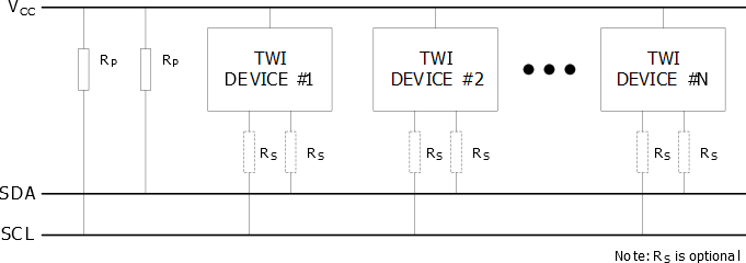 The TWI provides a simple, bidirectional, two-wire communication bus consisting of a serial clock line (SCL) and a serial data line (SDA). The two lines are open-collector lines (wired-AND), and pull-up resistors (Rp) are the only external components needed to drive the bus. The pull-up resistors provide a high level on the lines when none of the connected devices are driving the bus.