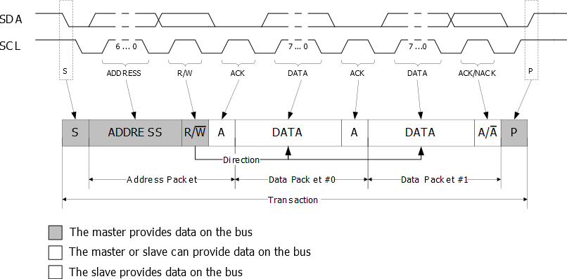 A master indicates the start of a transaction by issuing a Start condition (S) on the bus. An address packet with a slave address (ADDRESS) and an indication whether the master wishes to read or write data (R/W) are then sent. After all data packets (DATA) are transferred, the master issues a Stop condition (P) on the bus to end the transaction. The receiver must acknowledge (A) or not-acknowledge (A) each byte received.