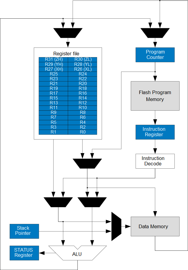 The ALU is directly connected to the fast-access register file. The 32 8-bit general purpose working registers all have single clock cycle access time allowing single-cycle arithmetic logic unit operation between registers or between a register and an immediate. Six of the 32 registers can be used as three 16-bit Address Pointers for program and data space addressing, enabling efficient address calculations.