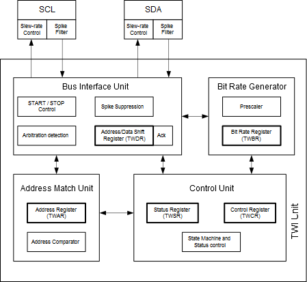 The TWI module is comprised of several submodules, as shown in the following figure. The registers drawn in a thick line are accessible through the AVR data bus.