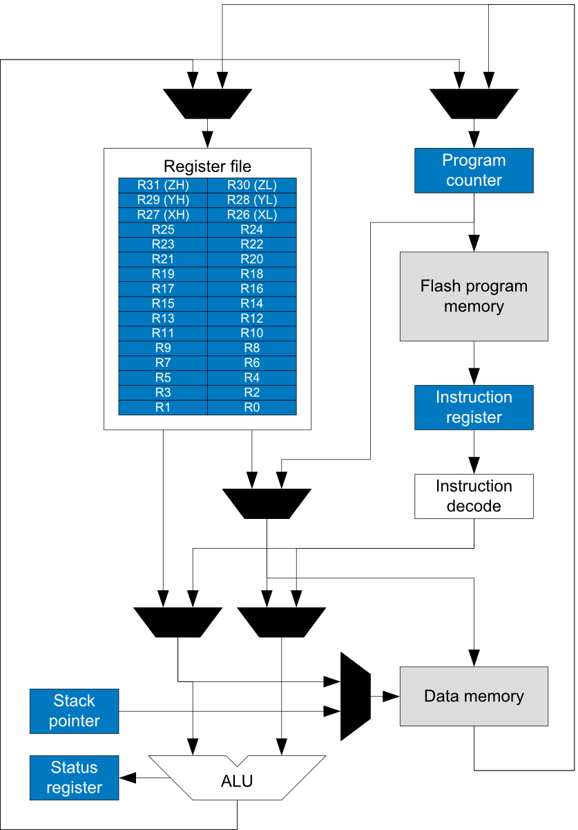 The fast-access register file contains 32 x 8-bit general purpose working registers with a single clock cycle access time. This allows single-cycle Arithmetic Logic Unit (ALU) operation. In a typical ALU operation, two operands are output from the register file, the operation is executed, and the result is stored back in the register file – in one clock cycle.