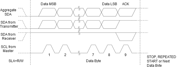 All data packets transmitted on the TWI bus are nine bits long, consisting of one data byte and an acknowledge bit. During a data transfer, the Master generates the clock and the START and STOP conditions, while the Receiver is responsible for acknowledging the reception. An Acknowledge (ACK) is signaled by the Receiver pulling the SDA line low during the ninth SCL cycle. If the Receiver leaves the SDA line high, a NACK is signaled. When the Receiver has received the last byte, or for some reason cannot receive any more bytes, it should inform the Transmitter by sending a NACK after the final byte. The MSB of the data byte is transmitted first.
