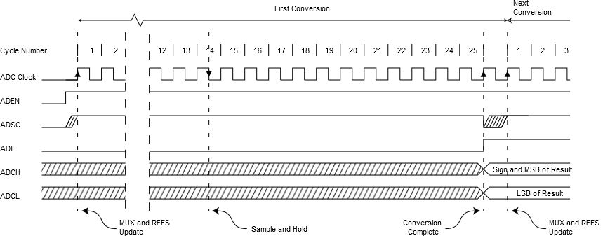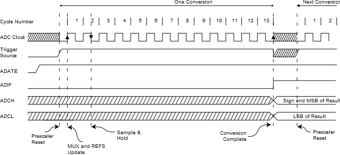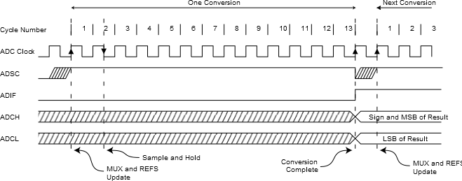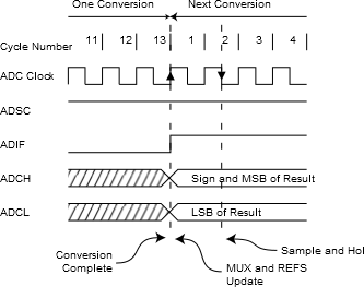 The actual sample-and-hold takes place 1.5 ADC clock cycles after the start of a normal conversion and 13.5 ADC clock cycles after the start of a first conversion. When a conversion is complete, the result is written to the ADC Data Registers (ADCL and ADCH), and the ADC Interrupt Flag (ADCSRA.ADIF) is set. In Single Conversion mode, ADCSRA.ADSC is cleared simultaneously. The software may then set ADCSRA.ADSC again, and a new conversion will be initiated on the first rising ADC clock edge.