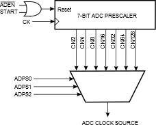 The ADC module contains a prescaler, which generates an acceptable ADC clock frequency from any CPU frequency above 100 kHz. The prescaling is selected by the ADC Prescaler Select bits in the ADC Control and Status Register A (ADCSRA.ADPS). The prescaler starts counting from the moment the ADC is switched on by writing the ADC Enable bit ADCSRA.ADEN to '1'. The prescaler keeps running for as long as ADEN=1 and is continuously reset when ADEN=0.