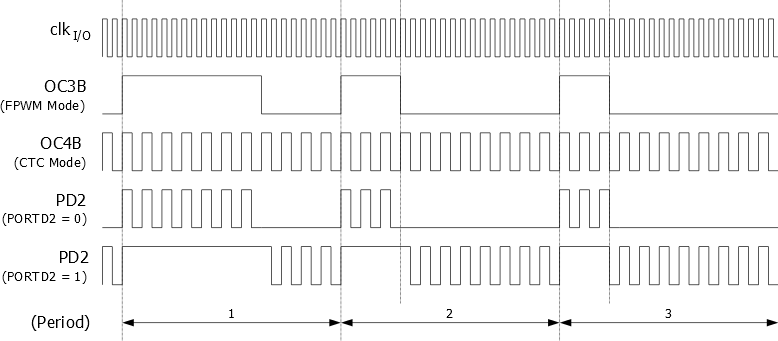 The figure below illustrates the modulator in action. In this example, the Timer/Counter3 is set to operate in fast PWM mode (non-inverted) and Timer/Counter4 uses CTC waveform mode with toggle Compare Output mode (COMx[1:0] = 0x1).