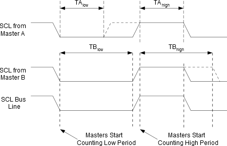 The wired-ANDing of the bus lines is used to solve both these problems. The serial clocks from all masters will be wired-ANDed, yielding a combined clock with a high period equal to the one from the master with the shortest high period. The low period of the combined clock is equal to the low period of the master with the longest low period. Note that all masters listen to the SCL line, effectively starting to count their SCL high and low time-out periods when the combined SCL line goes high or low, respectively.