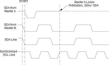 Arbitration is carried out by all masters continuously monitoring the SDA line after outputting data. If the value read from the SDA line does not match the value the master had output, it has lost the arbitration. Note that a master can only lose arbitration when it outputs a high SDA value while another master outputs a low value. The losing master should immediately go to Slave mode, checking if it is being addressed by the winning master. The SDA line should be left high, but losing masters are allowed to generate a clock signal until the end of the current data or address packet. Arbitration will continue until only one master remains, and this may take many bits. If several masters are trying to address the same slave, arbitration will continue into the data packet.