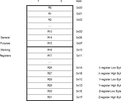 Most of the instructions operating on the register file have direct access to all registers, and most of them are single cycle instructions. As shown in the figure, each register is also assigned a data memory address, mapping them directly into the first 32 locations of the user data space. Although not being physically implemented as SRAM locations, this memory organization provides great flexibility in access of the registers, as the X-, Y-, and Z-pointer registers can be set to index any register in the file.