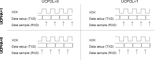 There are four combinations of XCKn (SCK) phase and polarity with respect to serial data, which are determined by control bits UCPHAn and UCPOLn. The data transfer timing diagrams are shown in the following figure. Data bits are shifted out and latched in on opposite edges of the XCKn signal, ensuring sufficient time for data signals to stabilize. The UCPOLn and UCPHAn functionality is summarized in the following table. Note that changing the setting of any of these bits will corrupt all ongoing communication for both the Receiver and Transmitter.