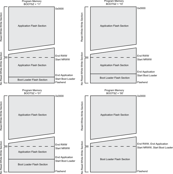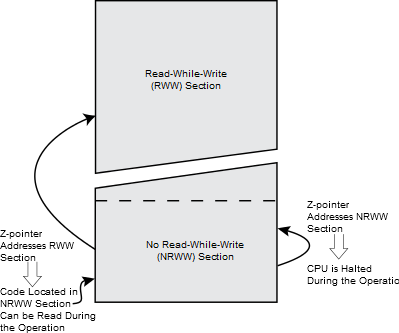 The code located in the NRWW section can be read when the boot loader software is updating a page in the RWW section. When the boot loader code updates the NRWW section, the CPU is halted during the entire page erase or page write operation.