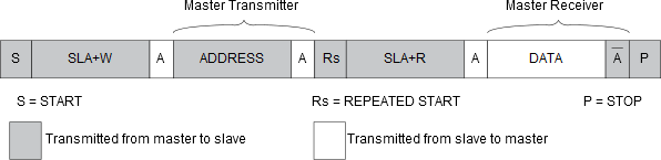 Note that data is transmitted both from master to slave and vice versa. The master must instruct the slave what location it wants to read, requiring the use of the MT mode. Subsequently, data must be read from the slave, implying the use of the MR mode. Thus, the transfer direction must be changed. The master must keep control of the bus during all these steps, and the steps should be carried out as an atomical operation. If this principle is violated in a multi-master system, another master can alter the data pointer in the EEPROM between steps 2 and 3, and the master will read the wrong data location. Such a change in transfer direction is accomplished by transmitting a REPEATED START between the transmission of the address byte and reception of the data. After a REPEATED START, the Master keeps ownership of the bus. The flow in this transfer is depicted in the following figure: