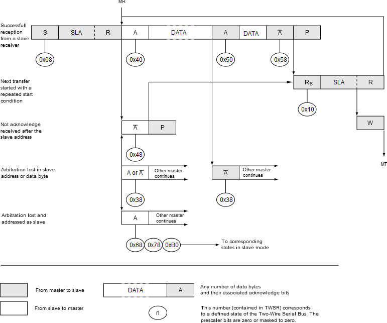 When SLA+R has been transmitted and an acknowledgment bit has been received, TWINT is set again and a number of status codes in TWSRn are possible. Possible status codes in Master mode are 0x38, 0x40, or 0x48. The appropriate action to be taken for each of these status codes is detailed in the table below. Received data can be read from the TWDR register when the TWINT flag is set high by hardware. This scheme is repeated until the last byte has been received. After the last byte has been received, the MR should inform the ST by sending a NACK after the last received data byte. The transfer is ended by generating a STOP condition or a repeated START condition. A repeated START condition is sent by writing to the TWI Control Register (TWCRn) a value of the type TWCRn=1x10x10x again. A STOP condition is generated by writing TWCRn=1x01x10x: