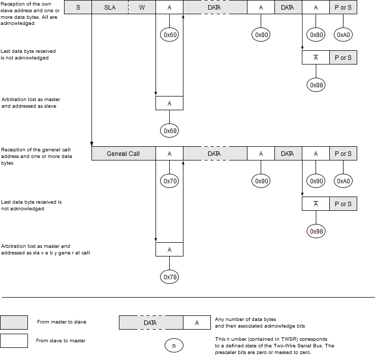 When TWARn and TWCRn have been initialized, the TWI waits until it is addressed by its own slave address (or the general call address, if enabled) followed by the data direction bit. If the direction bit is '0' (write), the TWI will operate in SR mode, otherwise, ST mode is entered. After its own slave address and the write bit have been received, the TWINT flag is set and a valid status code can be read from TWSR. The status code is used to determine the appropriate software action, as detailed in the table below. The SR mode may be entered if arbitration is lost while the TWI is in the Master mode (see states 0x68 and 0x78).