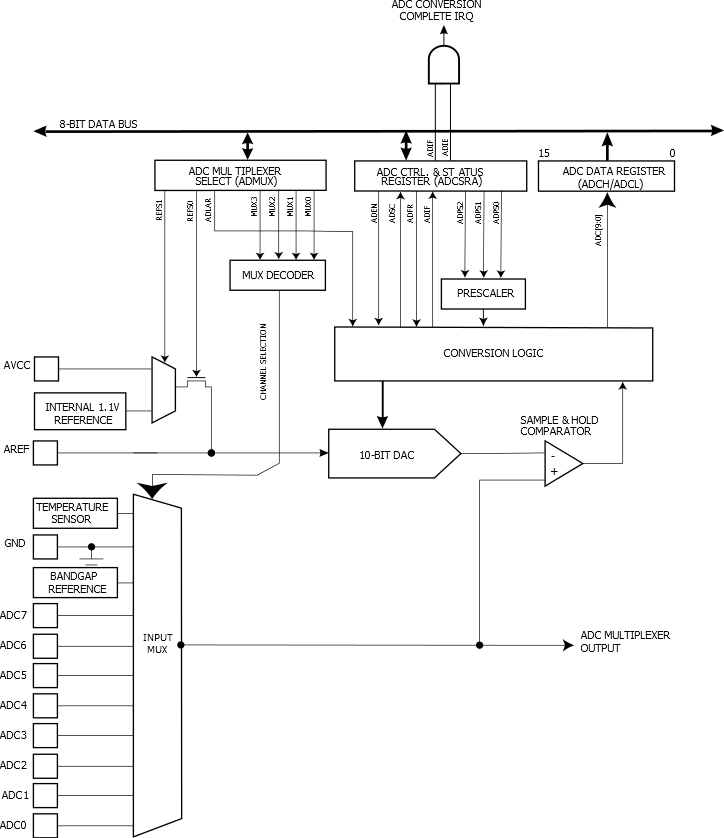 The device features a 10-bit successive approximation ADC. The ADC is connected to an 8-channel analog multiplexer which allows eight single-ended voltage inputs constructed from the pins of Port A. The single-ended voltage inputs refer to 0V (GND).