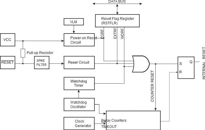 After all reset sources have gone inactive, a delay counter is invoked, stretching the internal reset. This allows the power to reach a stable level before normal operation starts.
