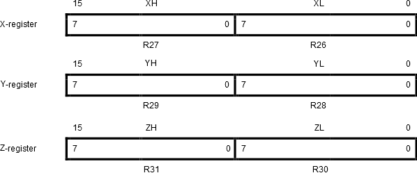The registers R26...R31 have some added functions to their general purpose usage. These registers are 16-bit address pointers for indirect addressing of the data space. The three indirect address registers X, Y, and Z are defined as described in the figure.