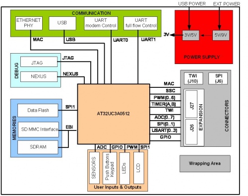 The circuit board has a flexible power system that accepts 8-20V DC input. The on-board DC/DC converters create system voltage used on the board. The core voltage for the CPU is generated through internal regulator in the AT32UC3A0512.