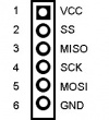 The SPI Interface is only six holes in pitch 2.54 mm (connector J6). It provides an easy probe area. 3.3 V is connected on pin 1 and GND is connected on pin 6 of connector J6. The SPI Interface follows the pinout: