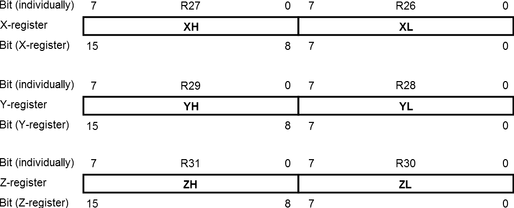 Refer to the instruction set or Instruction Set Summary for more information about how the X-, Y- and Z-registers are used.