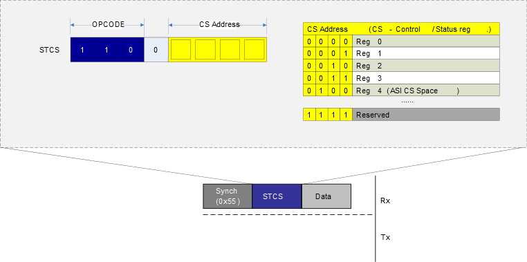 The STCS instruction is used to store data to the UPDI and ASI CS-space. STCS is based on direct addressing, where the address is part of the instruction opcode. The total address space for STCS is 16 byte, and can only access the internal UPDI register space. This instruction only supports byte access, and data size is not configurable.