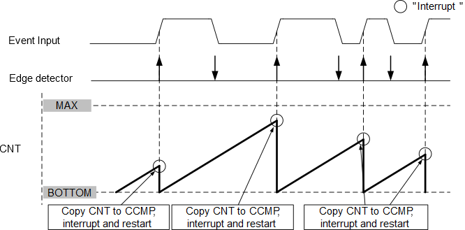 In this mode, the TCB captures the counter value and restarts on either a positive or negative edge of the event input signal.