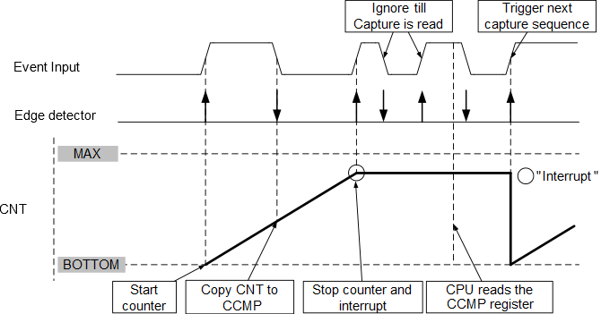 In this mode the timer will start counting when a positive edge is detected on the even input signal. On the following falling edge, the count value is captured. The counter stops when the second rising edge of the event input signal is detected and this will set the interrupt flag.