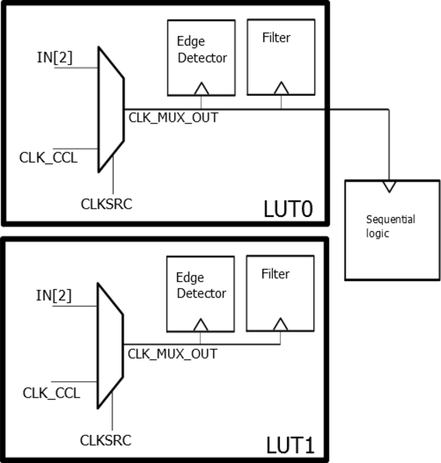 The Filter, Edge Detector, and Sequential logic are by default clocked by the system clock (CLK_PER). It is also possible to use the LUT input 2 (IN[2]) to clock these blocks (CLK_MUX_OUT in Figure 1). This is configured by writing the Clock Source bit (CLKSRC) in the LUT Control A register (CCL.LUTnCTRLA) to '1'.