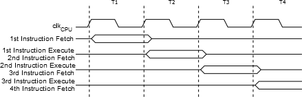 The AVR CPU is clocked by the CPU clock: CLK_CPU. No internal clock division is applied. The figure below shows the parallel instruction fetches and instruction executions enabled by the Harvard architecture and the fast-access register file concept. This is the basic pipelining concept enabling up to 1 MIPS/MHz performance with high efficiency.