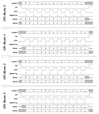 The SPI data transfer formats are shown below. Data bits are shifted out and latched in on opposite edges of the SCK signal, ensuring sufficient time for data signals to stabilize.