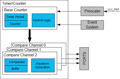 A timer/counter can be clocked and timed from the peripheral clock with optional prescaling or from the event system. The event system can also be used for direction control or to synchronize operations.