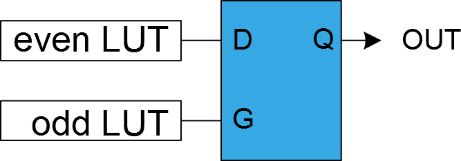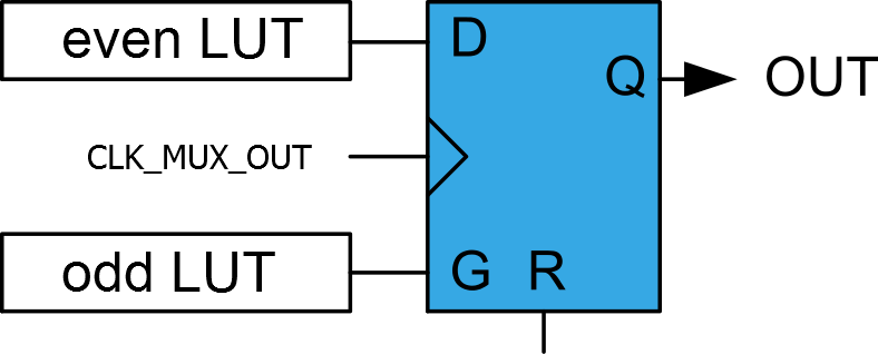The D-input is driven by the even LUT output (LUT0), and the G-input is driven by the odd LUT output (LUT1).