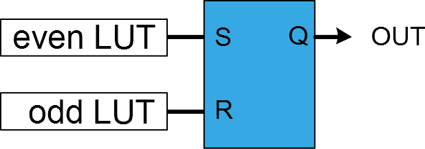 The S-input is driven by the even LUT output (LUT0), and the R-input is driven by the odd LUT output (LUT1).