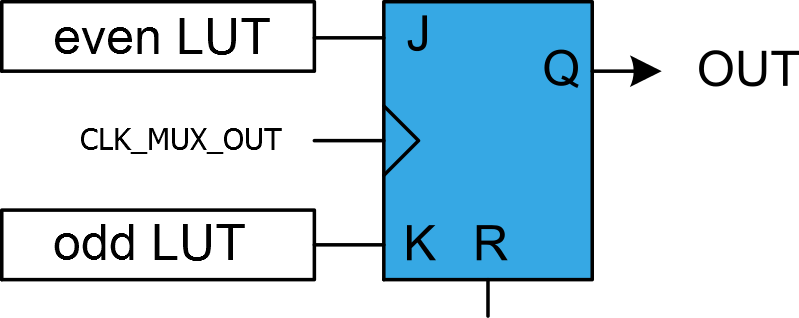 The J-input is driven by the even LUT output (LUT0), and the K-input is driven by the odd LUT output (LUT1).