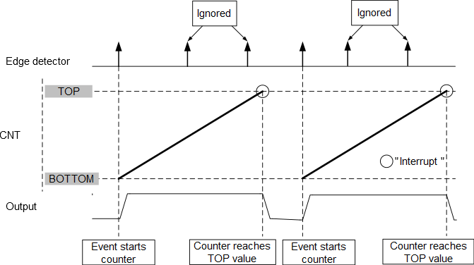 When the counter is stopped, the output pin is driven to low. If an event is detected on the connected event channel, the timer will reset and start counting from zero to TOP while driving its output high. The RUN bit in the STATUS register can be read to see if the counter is counting or not. When the counter register reaches the CCMP register value, the counter will stop and the output pin will go low for at least one prescaler cycle. If a new event arrives during this time, that event will be ignored. The following figure shows an example waveform. There is a two clock cycle delay from when the event is received until the output is set high. If the ASYNC bit in TCBn.CTRLB is written to '1', an asynchronous edge detector is used for input events to give immediate action. When the EDGE bit of the TCBn.EVCTRL register is written to '1', any edge can trigger the start of the counter. If the EDGE bit is '0', only positive edges will trigger the start.