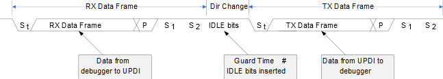 In order to ensure correct timing for half duplex UART operation, the UPDI has a built-in Guard Time mechanism to relax the timing when changing direction from RX mode to TX mode. The Guard Time is a number of IDLE bits inserted before the next Start bit is transmitted. The number of IDLE bits can be configured through GTVAL in UPDI.CTRLA. The duration of each IDLE bit is given by the baud rate used by the current transmission.