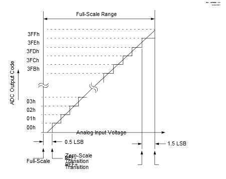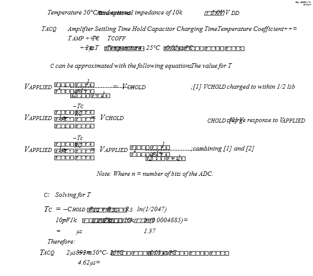 For the ADC to meet its specified accuracy, the charge holding capacitor (CHOLD) must be allowed to fully charge to the input channel voltage level. The Analog Input model is shown in ADC Acquisition Requirements. The source impedance (RS) and the internal sampling switch (RSS) impedance directly affect the time required to charge the capacitor CHOLD. The sampling switch (RSS) impedance varies over the device voltage (VDD), refer to ADC Acquisition Requirements. The maximum recommended impedance for analog sources is 10 kΩ. As the source impedance is decreased, the acquisition time may be decreased. After the analog input channel is selected (or changed), an ADC acquisition must be completed before the conversion can be started. To calculate the minimum acquisition time, Acquisition Time Example may be used. This equation assumes that 1/2 LSb error is used (1024 steps for the ADC). The 1/2 LSb error is the maximum error allowed for the ADC to meet its specified resolution.